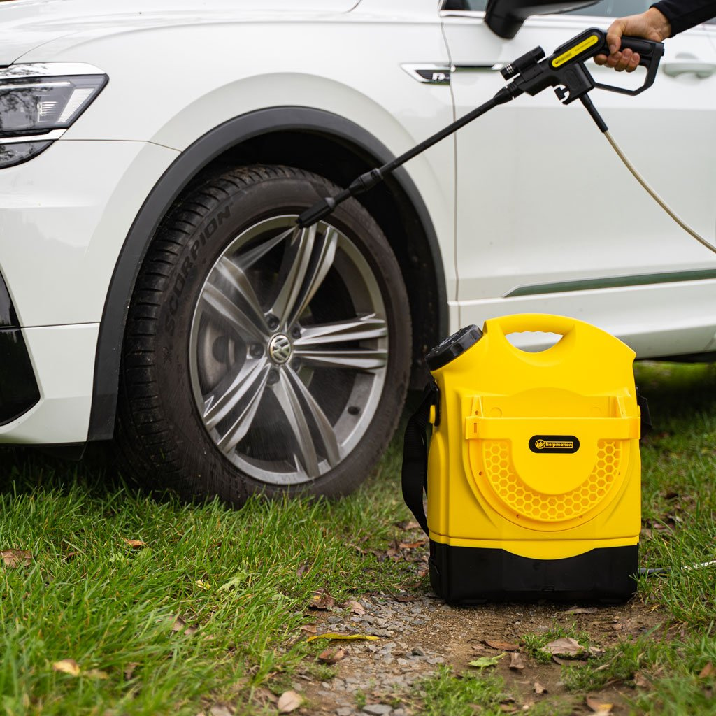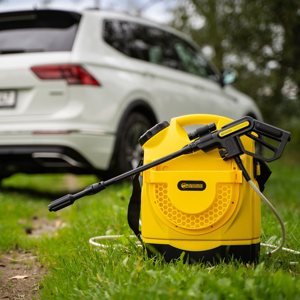 Přenosná tlaková myčka Helpmation jemně a precizně umyje kola na závodech nebo na dovolené, automobil, karavan, loď nebo zahradní nábytek a nářadí. Na jednu nádrž umyjete až 3 kola a dvě nádrže stačí na opravdu důkladné umytí osobního automobilu.